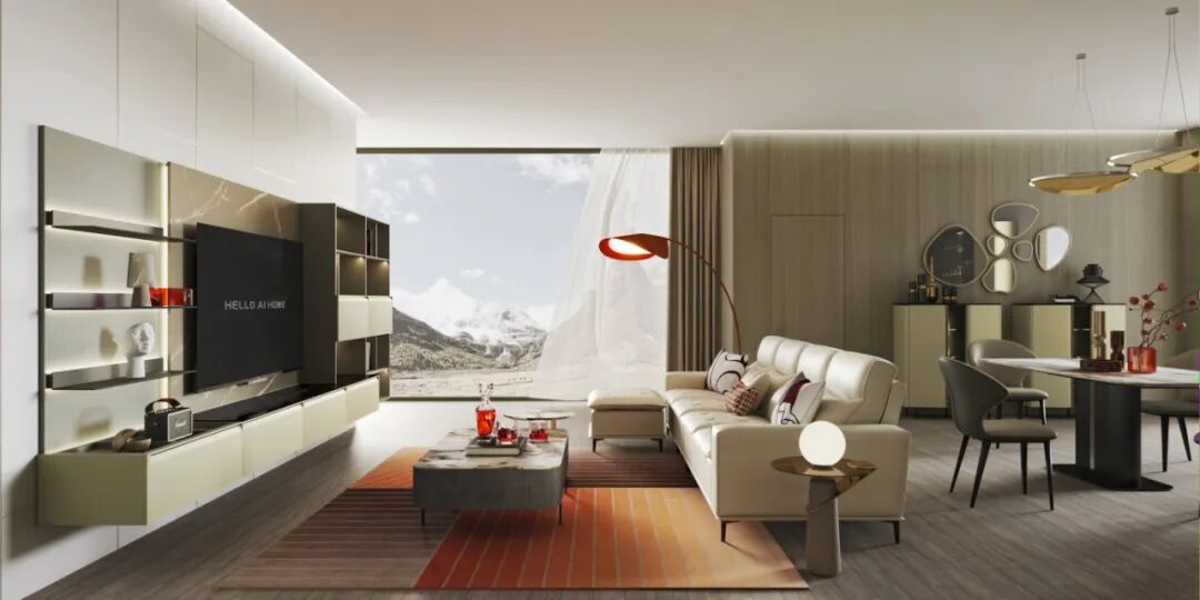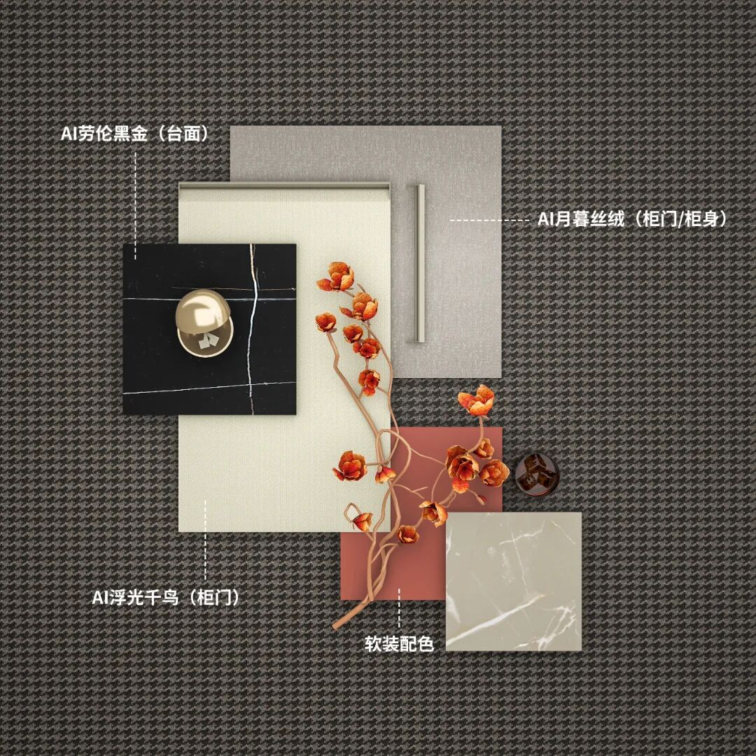 在暮言系列的色彩与软装搭配选择上,AI家居产品研发团队从傍晚到夜暮的光景中提炼色彩特征。以优雅经典的千鸟格纹,搭配富有光泽的绸缎肌理,天然石纹于中调和,实现奢感与自然的并存。一抹曼妙的红系软装点缀,营造奢雅精致的居住氛围。