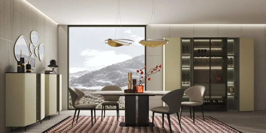 100°切角小餐边柜与大餐边柜遥相呼应,柔和光影在浮光千鸟的折射下,诉说出细腻的层次感。